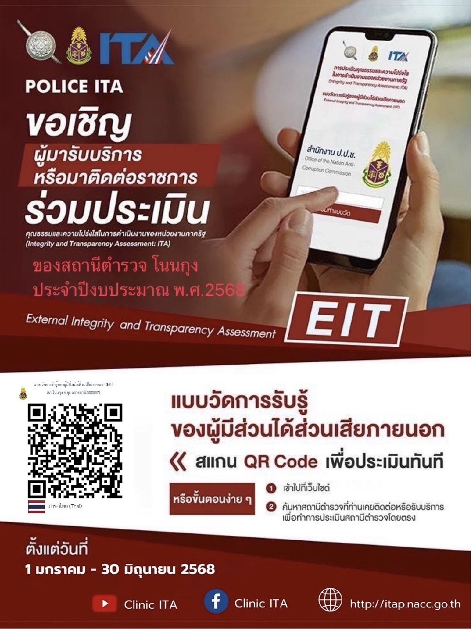 สถานีตำรวจภูธรโนนกุง แต่งตั้งคณะกรรมการดำเนินการในการขับเคลื่อนและกำกับติดตามการประเมินคุณธรรมและ ความโปร่งใสในการดำเนินงานของหน่วยงานภาครัฐ (Integrity and Transparency Assessment: ITA) ของสถานีตำรวจ ประจำปีงบประมาณ พ.ศ. 2568 โดยมี พันตำรวจเอก เทวราช เอื้อวงษ์ประเสริฐ ผู้กำกับการสถานีตำรวจภูธรโนนกุง เป็นประธานกรรมการ ดำเนินการตามคู่มือการประเมินคุณธรรมและความความโปร่งใสในการดำเนินงานของหน่วยงานภาครัฐ (Integrity and Transparency Assessment: ITA) ของสถานีตำรวจ ประจำปีงบประมาณ พ.ศ. 2568